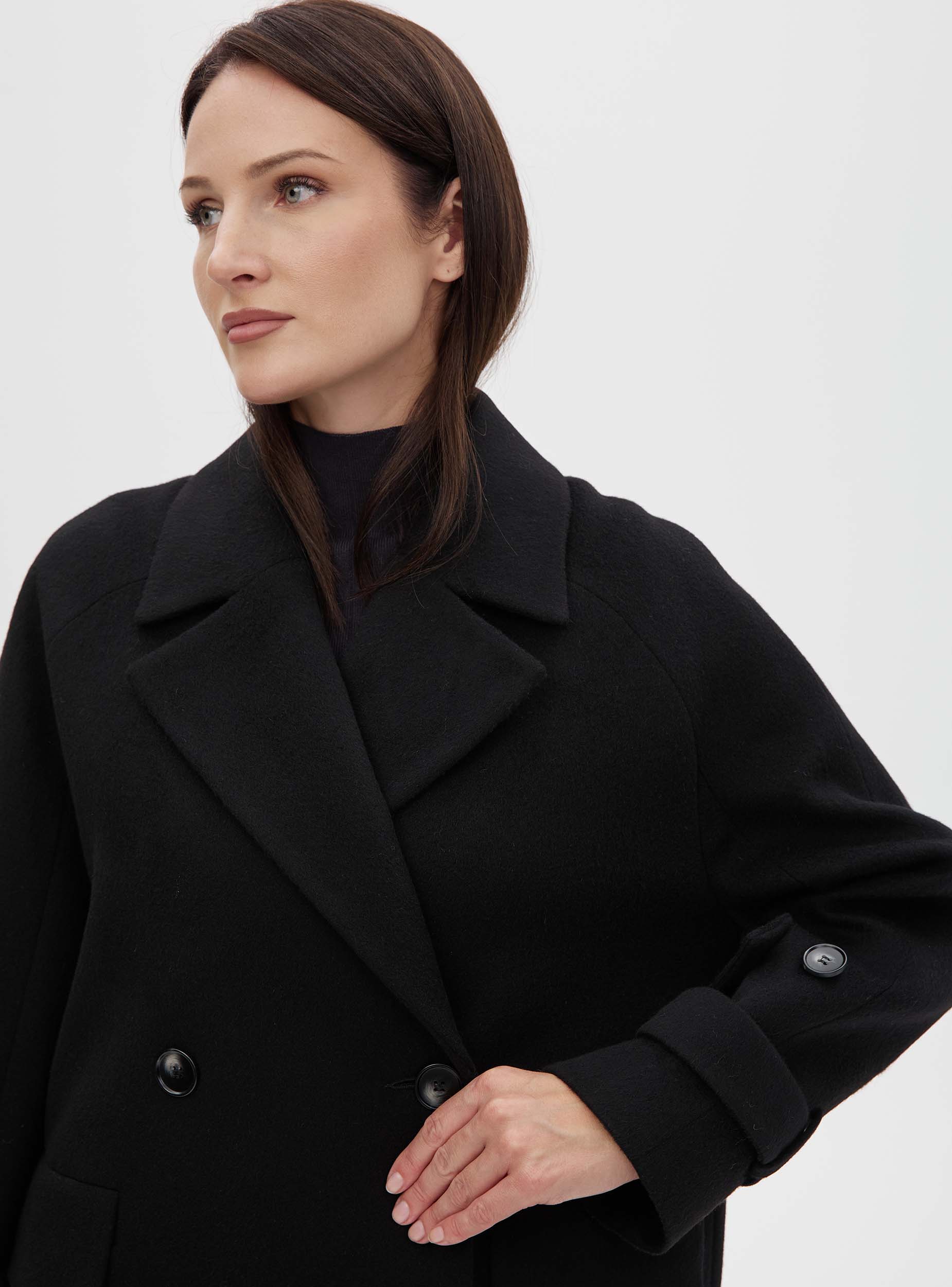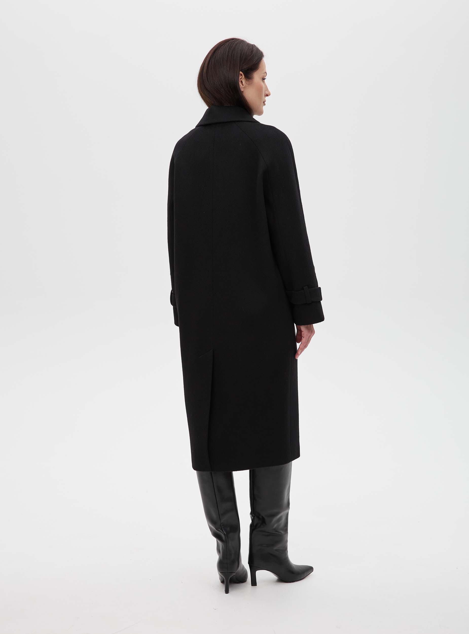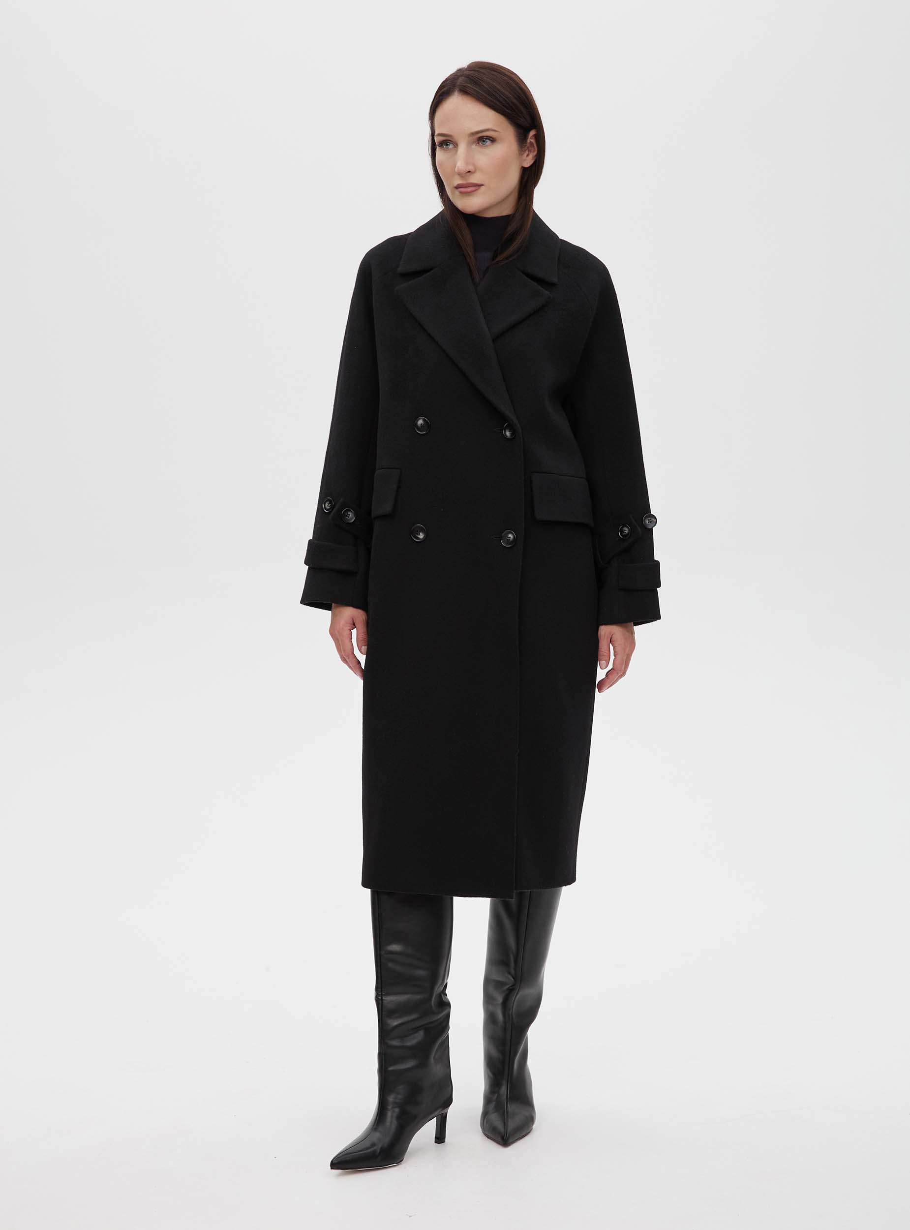 Двубортное женское пальто прямого силуэта из шерстяной ткани премиального качества. Пальто умеренного объёма, длина изделия до середины икры, что делает данную модель универсальной. Пальто хорошо сочетается как с брюками, так и с юбкой. Рукав трёхшовный оригинального кроя: верхняя часть - реглан, а нижняя - по конструкции втачного рукава. Такой крой позволяет сохранить комфорт посадки рукава реглан, при этом форма рукава выглядит более аккуратной и правильной. На рукаве есть круговая пата, позволяющая регулировать ширину рукава внизу. Благодаря гармоничному соотношению объёма и длины изделия пальто выглядит стильно и долго не будет терять своей актуальности.